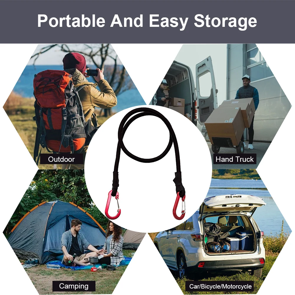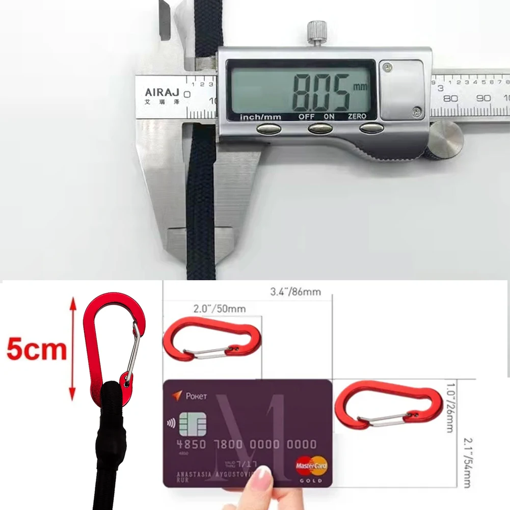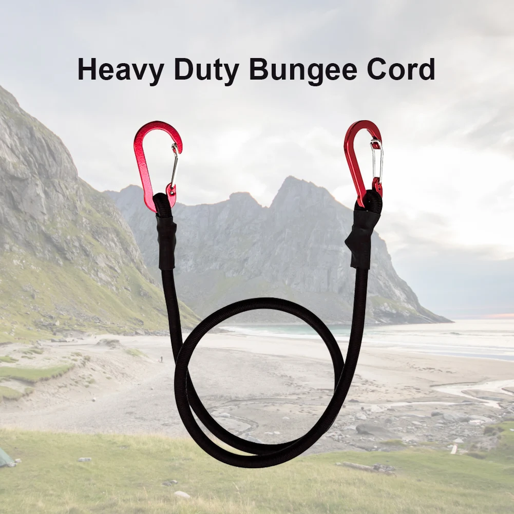 Heavy Duty Bungee Cord Aluminum Alloy Elastic Tie Strap String Carabiner Hooks Cord Elastic Rope for Luggage Rack Cargo Specification: Origin: Mainland China Material: Aluminum Alloy, Latex Elastic Rope Color: Black Red Length: 60cm/23.62in, 90cm/35.10in, 120cm/47.24in Rope Diameter: 0.8cm/0.31in Quick-Release Buckle: 5cm/1.97in Long