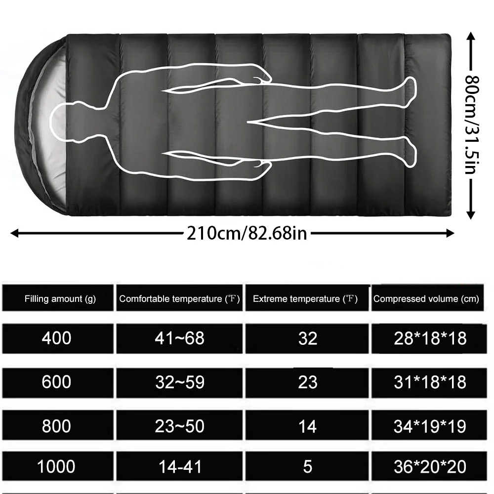 Preference Temperature: This versatile sleeping bag, filled with 400-1000gDuck down, is designed for use with a temperature range of 14°F to 68°F (-10°C to 20°C), making it ideal for Autumn and Winter. Suitable for both adults and children, these backpacking sleeping bags are indispensable camping essentials, suitable for outdoor adventures such as camping, hiking or sleeping in the car.